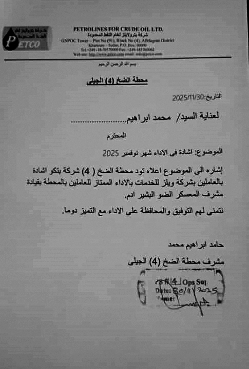 عظيم الشكر وفائق التقدير لما قدمتوه لضيوفنا الكرام من الشخصيات المهمة بشركة داربتروليم (جنوب السودان) وممثل وزارة النفط بحكومة جنوب السودان، مما رفع رأسنا أمام ضيوفنا بكرم الضيافة والأناقة في التنظيم والإستقبال ومستوي الإعداد و الجودة